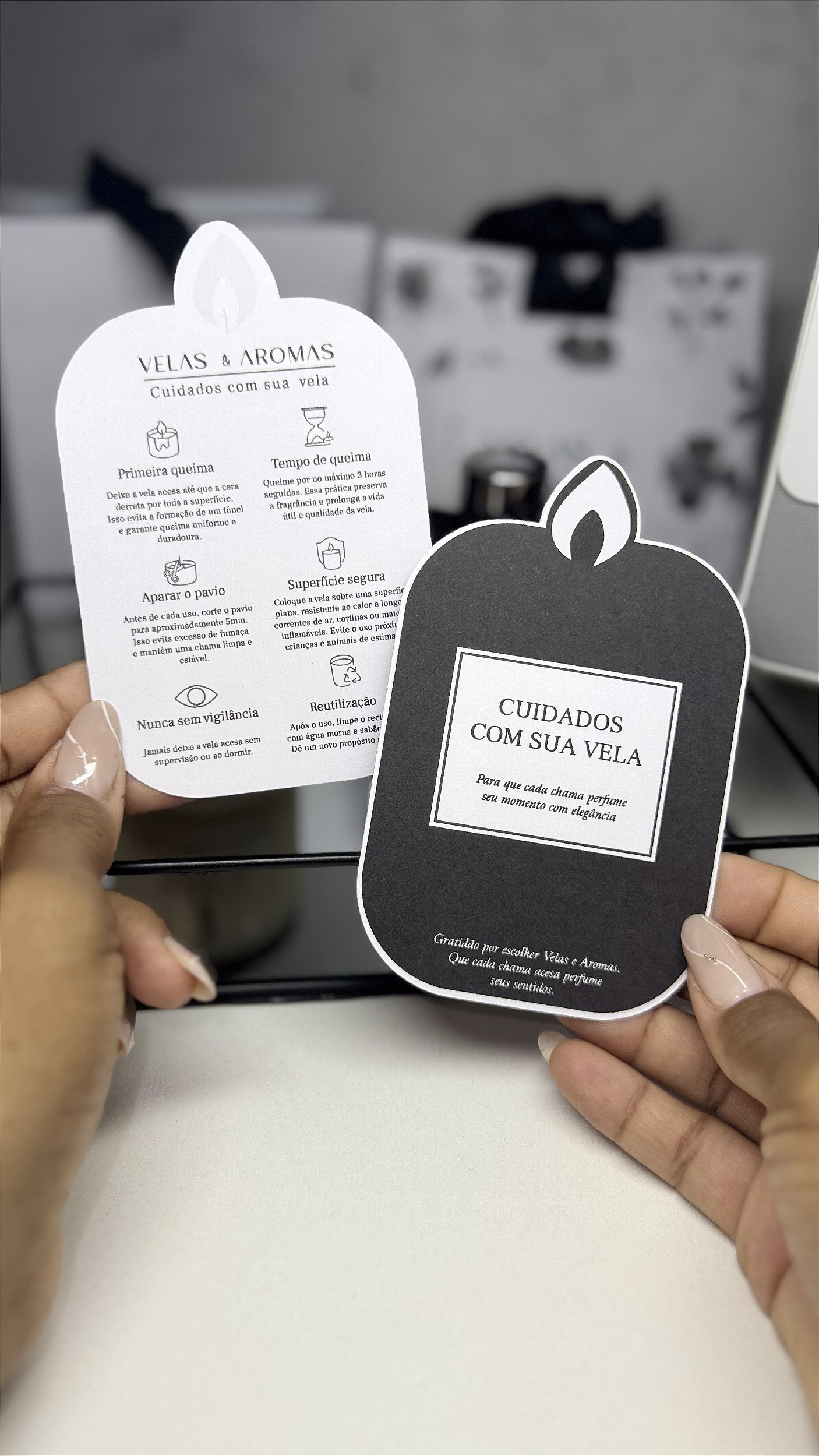 Cartão impresso em papel de alta qualidade com orientações essenciais para o uso seguro e correto das velas. Ideal para acompanhar seus produtos e agregar valor à entrega.